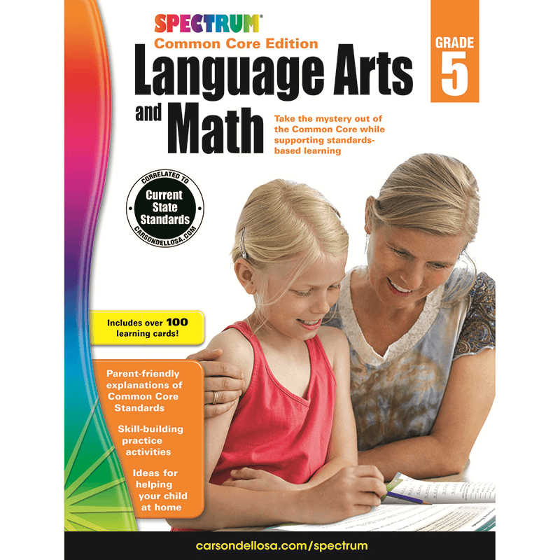 Spectrum Language Arts and Math: Common Core Edition for grade 5 helps parents understand Common Core Standards and helps students master essential Common Core skills. Engaging practice pages and sturdy flash cards help students with metaphors, prepositions, mixed numbers, volume, and more. Spectrum Language Arts and Math: Common Core Edition helps take the mystery out of current academic standards for busy parents. This unique resource for grades K – ;5 provides easy-to-understand overviews of Common Core learning standards for each grade level. Each title includes more than 100 skill-building practice pages, as well as more than 100 sturdy, cut-apart flash cards. The handy cards make it easy to review important skills quickly, at home or on the go. You will find all of the focused, standards-based practice your child needs to succeed at school this year.