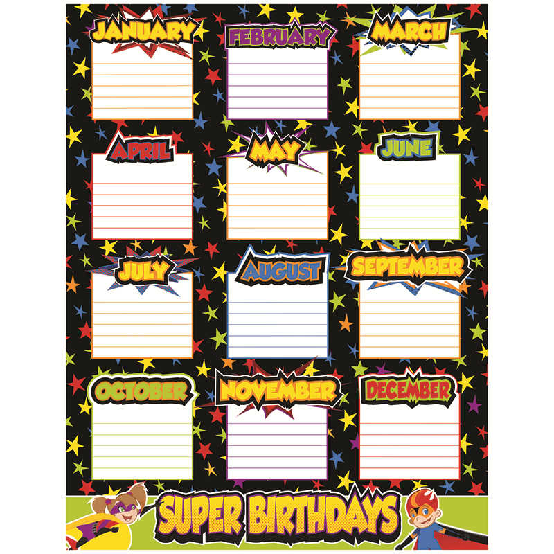 Energize your learning environment with the Super Power collection. The Super Power Birthday chartlet features a separate writing space for each month of the year, making it easy to proudly display your super students’ birthdays! Chartlets are excellent reference resources for students and teachers. Each colorful birthday chartlet measures 17 x 22 inches. Be sure to add other coordinating products to create a cohesive classroom theme!