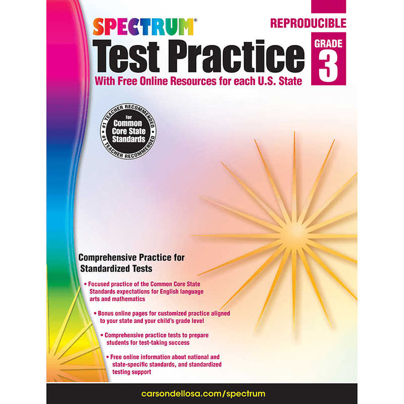 Spectrum test practice features 160 pages of Common Core aligned practice as well as online support and resources customized for all 50 states. The online resources include language arts and math practice tests for grades 1st through 8th.