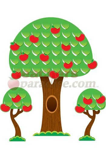 ‘- Tree, 40.5″ x 45.5″ with branches (32″ x 45.5″ without branches) – 2 branches, largest 11.5″ x 21.25″ – 42 apples – 2 grass patches – Resource guide’