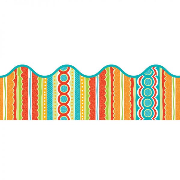 Add a twist of crisp and cool colors from the tropics with this contemporary Tropical Twist scalloped border. This design will add creativity to any class creation, bulletin board, window, locker, or anywhere a touch of style is needed. Perfect to use alone or in layers, borders are available in packs of thirteen 3′ x 2.25″ strips for a total length of 39′.
