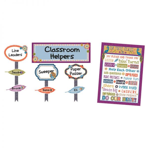 Perfect for displaying job or center assignments, the 52-piece You-Nique Classroom Management bulletin board is ideal for classroom organization. This set includes pieces that feature colorful peacocks and flowers, as well as a chart with messages that promote a positive classroom community. Create a learning environment that boosts your students’ spirits by adding stylish bulletin board sets to your classroom. These eye-catching sets are versatile by design, allowing the pieces to be used individually or together to assemble your ideal display. With bold colors and contemporary patterns, bulletin board sets offer more than just decoration – ;they help motivate your students by creating a fun, focused environment. Be sure to look for other coordinating products to create a cohesive classroom theme!
