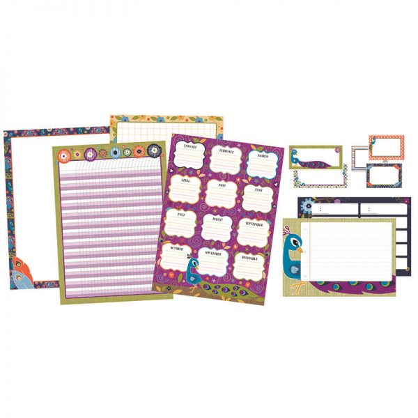 With a variety of charts and labels featuring colorful peacock and flower designs, the 21-piece You-Nique Classroom Organizers bulletin board helps keep an organized environment. This set includes birthday, incentive, and schedule charts to keep you up to date, while the labels offer organization. Create a learning environment that boosts your students’ spirits by adding stylish bulletin board sets to your classroom. These eye-catching sets are versatile by design, allowing the pieces to be used individually or together to assemble your ideal display. With bold colors and contemporary patterns, bulletin board sets offer more than just decoration – ;they help motivate your students by creating a fun, focused environment. Be sure to look for other coordinating products to create a cohesive classroom theme!