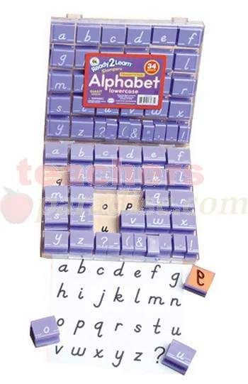 Ready2LearnT Transitional Modern Alphabet Stampers aid students in making the jump from printing to cursive writing. These 34 rubber stamps, with easy-to-grip plastic handles, come in their own clear, labeled and sectioned storage case and include 26 alphabet and 8 punctuation stamps.