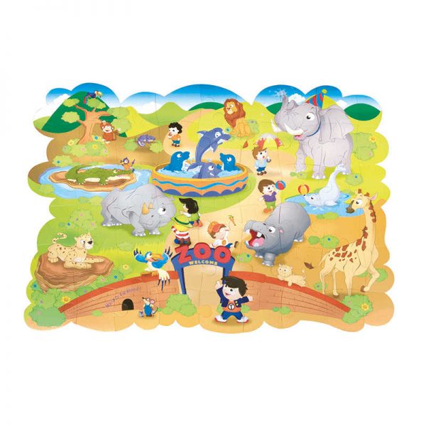 Almost as much fun as a real trip to the zoo! A great variety of zoo animals in their natural habitat are depicted in this 54 piece puzzle. The puzzle measures 4 feet x 3 feet and pieces are extra large for small hands to use.