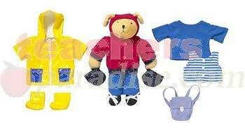 These huggable, learn to dress animals don’t only teach dressing skills, they also teach the appropriate clothing for different weather conditions. Dressed in a sweat suit, additional clothing includes a winter coat, hat mittens, rain gear, and a fanny pack. Children develop dexterity as they buckle, zipper, button, Velcro and lace. Machine washable and dryable.