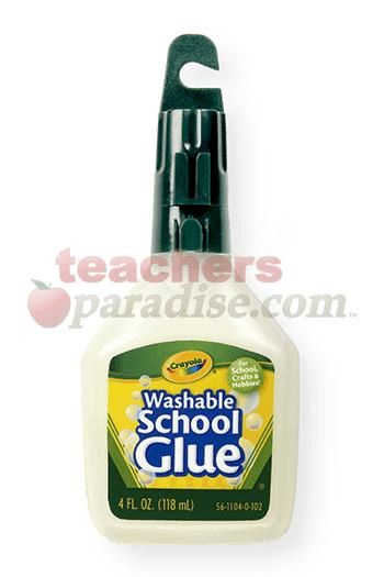 Crayola School Glue has a washable, no-run formula. The 4-oz. bottle features a “no clog” tip. This glue stays where you put it! But, if you do happen to put it in the wrong place, dried glue cleans up easily with soap and water. Crayola School Glue is safe and nontoxic. Recommended for ages 3 and up.
