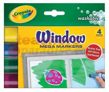 Do more decorating in less time with the new Crayola Window FX Mega Markers! The only window marker product that is washable from windows and clothing! The special marker formula works on windows, mirrors, frames and more. Includes 4 bright colors: Vivid Blue, Radiant Rose, Sunny Yellow and Glistening Green. Each marker has an extra-large nib for great coverage on windows. Also, includes almost 3 times the amount of ink in regular Window FX Markers.