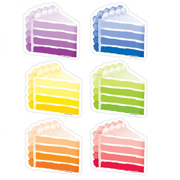 Sweet and festive Cake Slices 3″ color cut-outs are layered with an ombre of yummy colors and accented with swirls of creamy frosting.