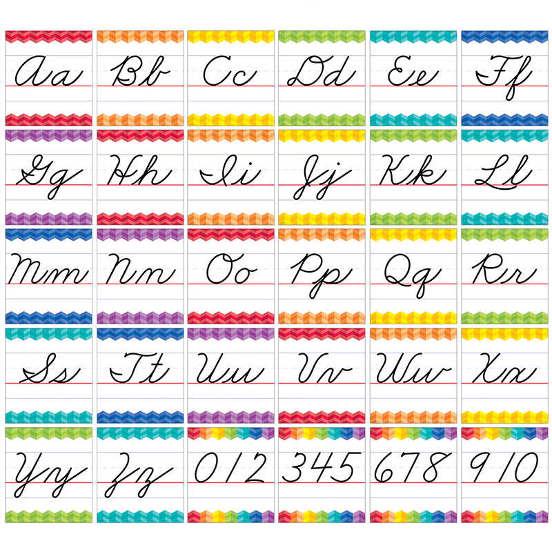 This Cursive Manuscript Alphabet Line bulletin board is accented by a colorful herringbone pattern. Use this cursive alphabet line as a handy reference for students who are just learning cursive writing or for older students who need a visual reminder. This set includes clear and easy-to-read uppercase and lowercase cursive letters of the alphabet and numerals 0 – ;9 to reinforce letter and number recognition, formation, and order. Each cursive letter card measures approx. 8″ x 8.75″. Entire Cursive Alphabet Line measures 17.33′.