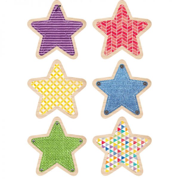 Rustic patterns, textures and woodgrain make these Stars 6″ cut-outs perfect for any bulletin board or school space. The “mixed media” feel of denim, paint, burlap, corrugated paper, metal accents and weathered paint give these cut-outs a modern yet cozy feel.