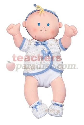 Dolls are 15 inches long and surface washable. Soft and cuddley. Dolls comes dressed in a removable blue outfit and diaper.