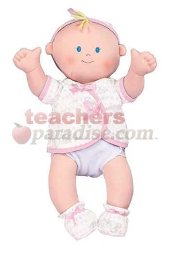 Dolls are 15 inches long and surface washable. Soft and cuddley. Dolls comes dressed in a removable pink outfit and diaper.