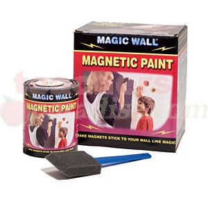 Turn any wall surface into a magnetic attraction with Liquid Magic Wall! This 100% Acrylic Latex magnetic receptive paint is lead free and safe for use in a child’s room. Cleans with soapy water. For best results apply several coats to desired surface. Foam brush included.
