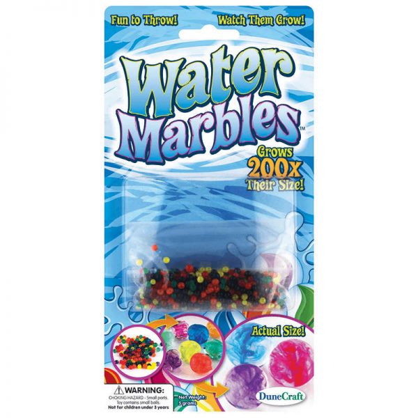 Drop your colorful Water Marbles in a cup of water and watch in shock as they grow over 200 times in size! In a matter of hours, you will have hundreds of beautiful, full-size Water Marbles. The warmer the water, the faster they hydrate. Throw them, roll them, bounce them, and catch them. Enjoy the hot colors and the unique patterns. Water Marbles are slippery, slick and cool. Water Marbles are non-toxic, and safe for ages 3 and up.