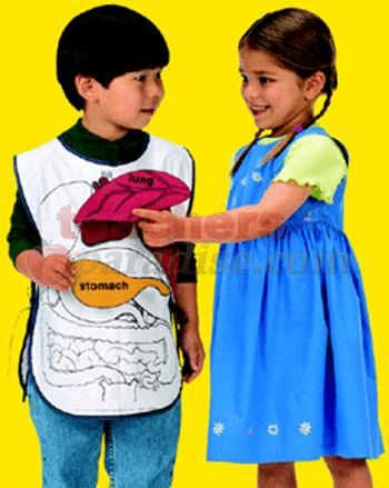 Washable vinyl apron pre-printed with outlines of the internal body organs, helps children learn the names and locations of the heart, liver, lungs, intestines, kidneys, and stomach. Colorful cutout organs attach with Velcro. Includes teacher’s guide and reproducible activities.