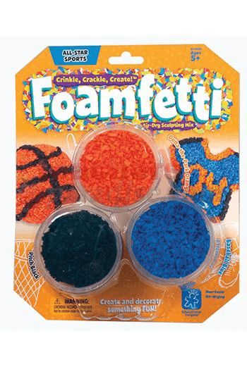 Hey, sports fans! Here’s your chance to make an all-star creation with FoamFetti? in orange, blue and black. Air-dries into a winning creation that lasts. Ages 5