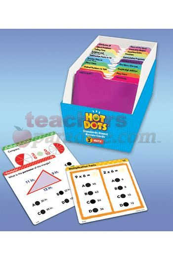 Hot Dots standards-based math question cards are perfect for reinforcing the math skills that students need to master at the 3rd grade level. The set includes 600 self-checking questions aligned to national and state math curriculum standards, and provides curriculum coverage for 25 important math skill areas. Box feature sturdy, full-color question cards, 25 skill-area tabs, reproducible student progress sheet and guide.