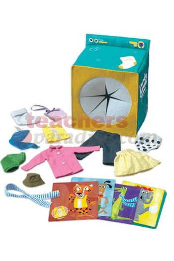 Help the animals get dressed! Reach inside the dryer and explore using only your sense of touch. Players try to match picture cards with articles of clothing they feel inside the dryer. Engaging 3-D game play encourages tactile exploration, fine motor skills, and counting. Great for practicing animal names and clothing words, too. Ages 4 / Grades PreK