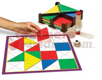 Think carefully, but think fast! Players roll the die and use the specified tiles to create shapes and cover their boards with multi-colored squares. Includes 4 game boards, 32 large triangles, 32 small triangles, 16 squares, 1 shape tray, 1 die, and a timer. For 2 to 4 players.