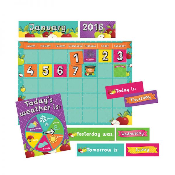 Track the weather and the days of the week with this apple-solutely awesome display! Includes 23.75 x 17.5″ calendar grid, weather chart, 33 date cards, 30 special day cover-ups, Yesterday was, Today is, and Tomorrow is cards, Seven day of the week cards, year cards: 2016, 2017, and blank.