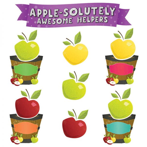 Give student helpers an apple-solutely awesome visual for classroom jobs! Includes “Apple-solutely Awesome Helpers!” banner, 8 customizable bushel baskets for classroom jobs, and 36 apples for student names. Teacher guide with activities and reproducibles also included. Set of 45 pieces. Largest piece measures 4.5 x 17″.