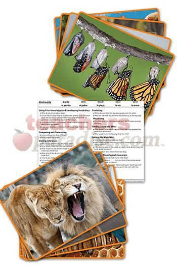 Familiar topics and comprehension questions help develop pre-reading skills! Each full-color photo card features comprehension questions on the back that allow teachers to prompt students to discuss and comprehend the meaning of the image. Cards develop essential reading comprehension skills such as phonological awareness, vocabulary, predicting, sequencing, visualizing, inference, cause and effect, main idea and more.