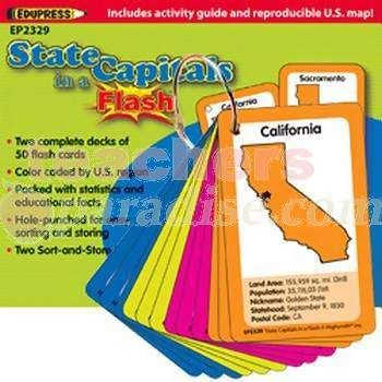 These unique flash cards offer students a wealth of information about states and their capitals! Each card features a state outline on both the state and capital side, color-coded by U.S. region to aid in recognition. State nicknames, land areas, populations, date of statehoods, postal abbreviations and notable names provide lots of stepping off points for extension activities.