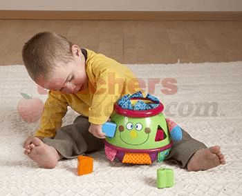Durable plastic shape sorter Loaded with learning tools; colors, shapes, numbers, textures, rounded bottom with musical chime activation when rocked. Size: 18 X 18 cm.