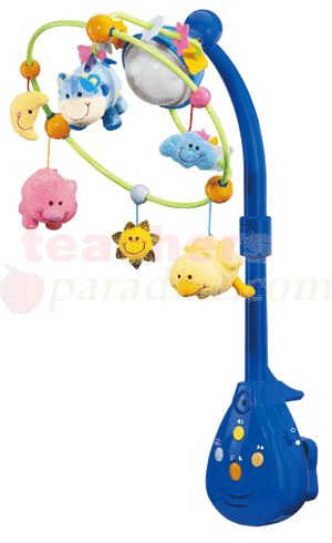 Watch your little one happily fall asleep as soft colorful animals glide over baby’s head while soothing lights stimulate and captivate. Features remote control with “never lose” door knob hanger. Choose from soothing lullabies, up-tempo classical style songs or nature soundscapes. Attaches easily to most cribs.