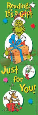 Dr. Seuss “the Grinch” Bookmarks. Our colorful bookmarks are die cut with a notch to hook over the page. Each bookmark measures 2″ x 6″, and each package contains 36 identical bookmarks.