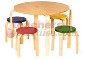 Simplistic design and beauty, with natural bent wood contours and smooth edges invite kids to sit for a while and create, snack, read and more. Features a smooth, natural finish that will blend in with any environment. Includes table and 4 stools in your choice of all natural or colored stools. Additional shipping charges apply.