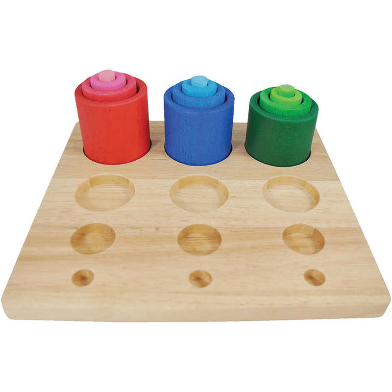 The unique design of these wooden puzzle allows for several exciting ways to play and learn. The brightly colored cyclinders are graduated in size and nest together, inspiring exploration and promoting fine motor and shape-recognition skills. Also, each series of shapes feature colors that range from primary to pastel: as the pieces get smaller, the colors get lighter. Made from eco-friendly rubberwood and stained with low VOC aniline dyes.