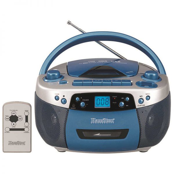 HAMILTON ELECTRONICS VCOM BOOM BOX USB PORT CD MP3 PLAYER CASSETTE RECORDER AM FM RADIO HECMPC5050PLUS