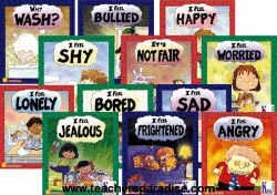 Kid-To-Kid “Feelings” Books are warm, humorous stories that are told by children to explore how to manage their own feelings and how to respond when they meet those feelings in others. Each book offers young readers kind-hearted guidance about important life skills at an early reading level. 32 pages. Ages 5-8. Complete Set includes 12 books, 1 each of 12 titles plus 3 Teacher Idea Books. Set Includes: I Feel Angry I Feel Lonely I Feel Bored I Feel Sad I Feel Bullied I Feel Shy I Feel Frightened I Feel Worried I Feel Happy It’s Not Fair I Feel Jealous Why Wash?