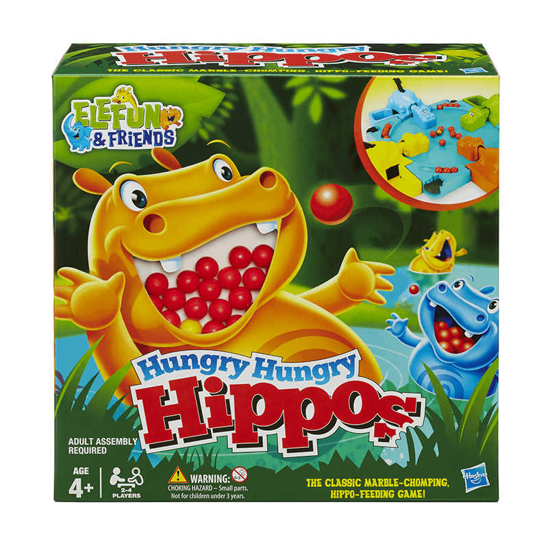 The frenzied, marble-chomping game, features FOUR, brightly-colored Hungry Hippos that want to munch a bunch of marbles!The faster you press their tails, the more marbles they try to chomp. If your hippo gobbles the most you win!Keep your eyes peeled and your hippo ready- because now there’s ONE special marble; be the first to munch it- and you’re the instant winner!Comes with: hippos game base and 4 hippos, 20 bright red marbles, updated design for easy in-box re storage and a NEW marble storage area. 24 players. Ages 4