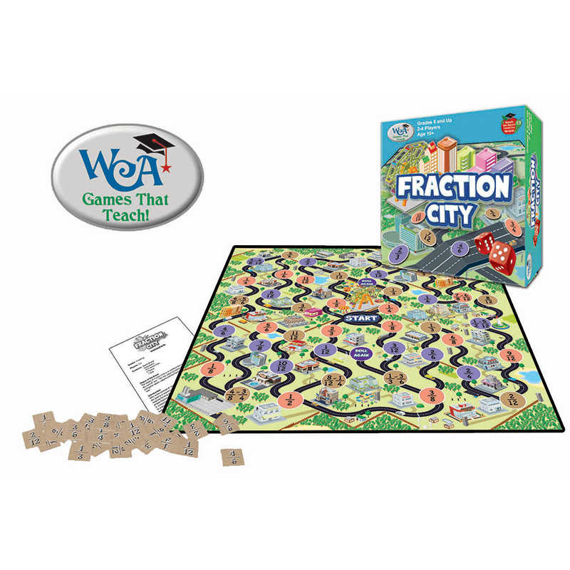 Travel the roads of Fraction City where everything you see is in fractions! Understanding the concept of “one” is key in grasping fractional concepts. In this fun game, players learn to add and subtract fractions to reach “one” and score. The more fractions you can use, the quicker you can reach the winning score of 10. On this colorful game-board, 29 of the most commonly used fractions in the real world are utilized. Key objectives are determining common denominators, and combining two, three, and four fractions that equal “one”. Additional games and ideas are included.