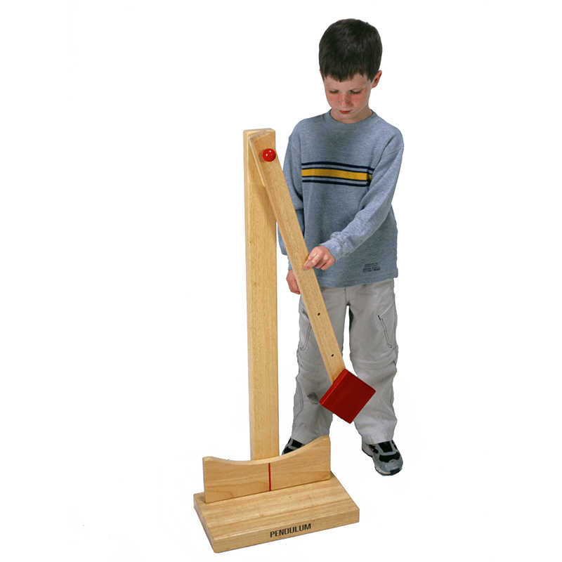 As the pendulum swings back and forth, its energy changes from potential energy (the energy it has at the top of its swing, when it is raised up) into kinetic energy (the energy of motion). But the pendulum can be used as a device to explore other concepts as well. The time for one swing doesn’t depend on the size of the swing or the mass at the end of the pendulum, only on the length. This is why the pendulum came to be used in the earliest accurate clocks! This classic wooden model offers children a basic concept of the laws of physics. Demonstration sized.