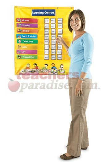 Promote independence and organization! Cards printed with common early childhood centers: Listening, Art, Puzzles, Blocks, Pretend Play, Sand & Water, Quiet Area, Writing, Games, ABCs. Provides visual cues for pre-readers – ;photos on one side of card, illustrations on reverse. Includes 5 blank write & wipe center cards, 30 name cards, 2 titles, plus 10 corresponding tabletop signs (3″L x 4″H) to place at your centers. Grommeted nylon chart measures 28″L x 32 1/2″H and features storage pocket. Grades PreK