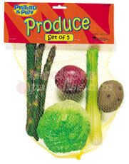 Stock any pretend kitchen with this durable, realistic-looking produce set. Made of soft plastic. Includes potato, red onion, asparagus, celery and lettuce. Ages 3 .