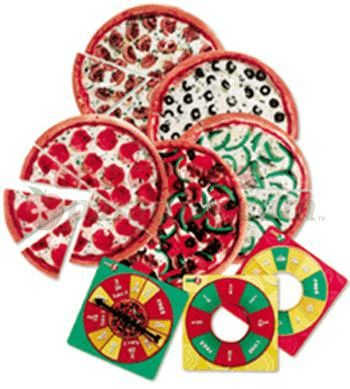 Pizza Fraction Fun? Jr. A creative way to deliver an understanding of fractions! Seven games offer different levels for learning the values of: 1/2, 1/3, 1/4, 1/5, 1/6, 1/8, 1/10 and 1/12. Students practice identifying fractions, matching fraction equivalents and adding and subtracting fractions. Game includes 11 double-sided pizzas (one side is labeled with the fraction) with 59 individual slices, three double-sided spinners and game guide. For 2-6 players. Pizzas are 8 inch in diameter. Made with durable cardboard.