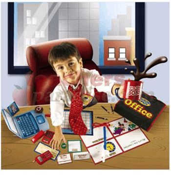 Everything kids need for a pretend day at the office is tucked into this official-looking briefcase. Realistic 74-piece set includes a desk calendar, pretend stapler, cell phone with sound, ID badge and many other office essentials – ;even a stack of paychecks and refillable crayon “pen”!