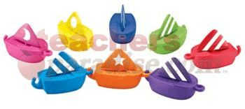 Set sail for smart fun with this colorful set of 16 sailboats! A natural addition to any sand or water table, these little ships invite children to match colors and shapes while building hand-eye coordination and fine motor skills. Detachable striped sail feature uniquely shaped masts that fits only in the boat of the matching color. Each 2-piece sailboat links together and measures 4 1/2″L x 2″W x 2 3/4″H. Mold-resistant plastic pieces hang to dry and store in the included mesh bag.