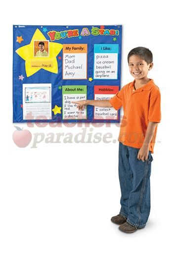 Reward positive behavior, build classroom community and celebrate! Features pockets to display student work, compliments from teacher, photos and the 5 large write & wipe cards (provided) for student info. Activity Guide includes blackline masters (parent letter, student info sheet and award). Grommeted nylon chart measures 28″L x 28″H.
