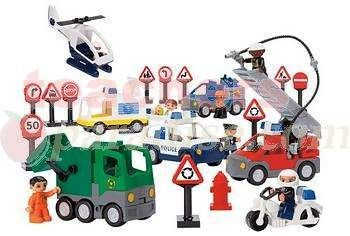 A delightful set of DUPLO community service vehicles, road signs and community characters. The set allows children to explore how their community is kept on the move. Includes police, ambulance, waste collection vehicle and tow truck.
