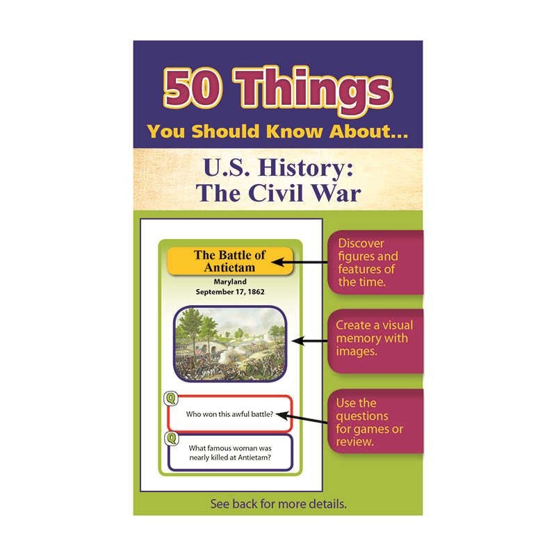 The issue of slavery divided the nation and pushed it into the Civil War. With these 50 flash cards of figures and features, you can expand your knowledge about that period. Test yourself or challenge a friend with ready-made questions about famous figures like Ulysses S. Grant and Robert E. Lee, or battles like Gettysburg and Antietam. Flip the card over to find the answers and more fascinating facts. Then discover historical connections with the bonus Connect a Card question. Every deck in the series is great for learning, review, trivia, and more!