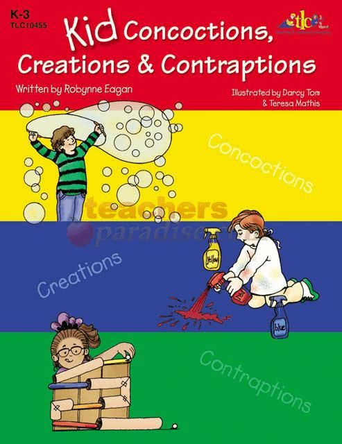 Kid Concoctions, Creations & Contraptions Is learning an exciting activity in your classroom? It will be if you use the creative ideas in this book! Your students will investigate, create and discover while acquiring knowledge and skills in all areas of the curriculum. The open-ended learning activities give students opportunities to explore scientific concepts through active experimentation and design technological contraptions with actually work. They’ll make concoctions such as fizzing potions, crystals, critter food and musical vegetables. They’ll learn how to whip up creations that include Awesome Dough, Rawhide Glue and Glitter Squeeze Paint. And they’ll turn everyday items into original kid contraptions, using creative problem-solving skills