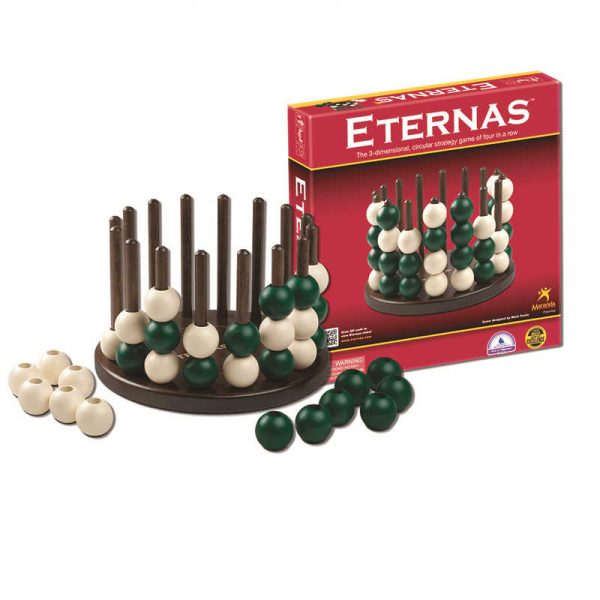 ETERNAS is a clever new 3-dimentsional strategy game of four in a row. The rules and concepts are simple enough to appeal to students as young as 4 years old and as old as 94! But, don’t let the simplicity fool you. While ETERNAS is quick and easy to learn, there is a depth of strategy that will keep your students thinking. ETERNAS is a four in a row style game in which the first player to place four beads of their color in a row; either vertically, horizontally or diagonally, wins the game. HOWEVER… unlike other 4-in-a-row games, ETERNAS is designed for borderless play in the round. This totally changes the necessary problem-solving approach!! If all 16 beads are placed on the round and no one has connected 4 in a row, players must reallocate their beads. But, be careful not to forget why that bead was placed there in the first place! The rules have been drafted so that there is always a winner; no ties, stalemates, or cat’s games. Because it can absorb 2 students in quiet concentration for 8-10 minutes, it’s the perfect game to keep out on the table for students who finish their work early.