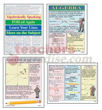 This pack contains everything you need to create an educational display of important algebra concepts, including variables, expressions, terms, slope, linear equations, solving equations, polynomials, and more.