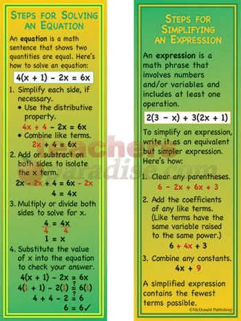 These two-sided bookmarks clearly present the steps involved in simplifying an expression and solving an equation. 36 bookmarks per pack.